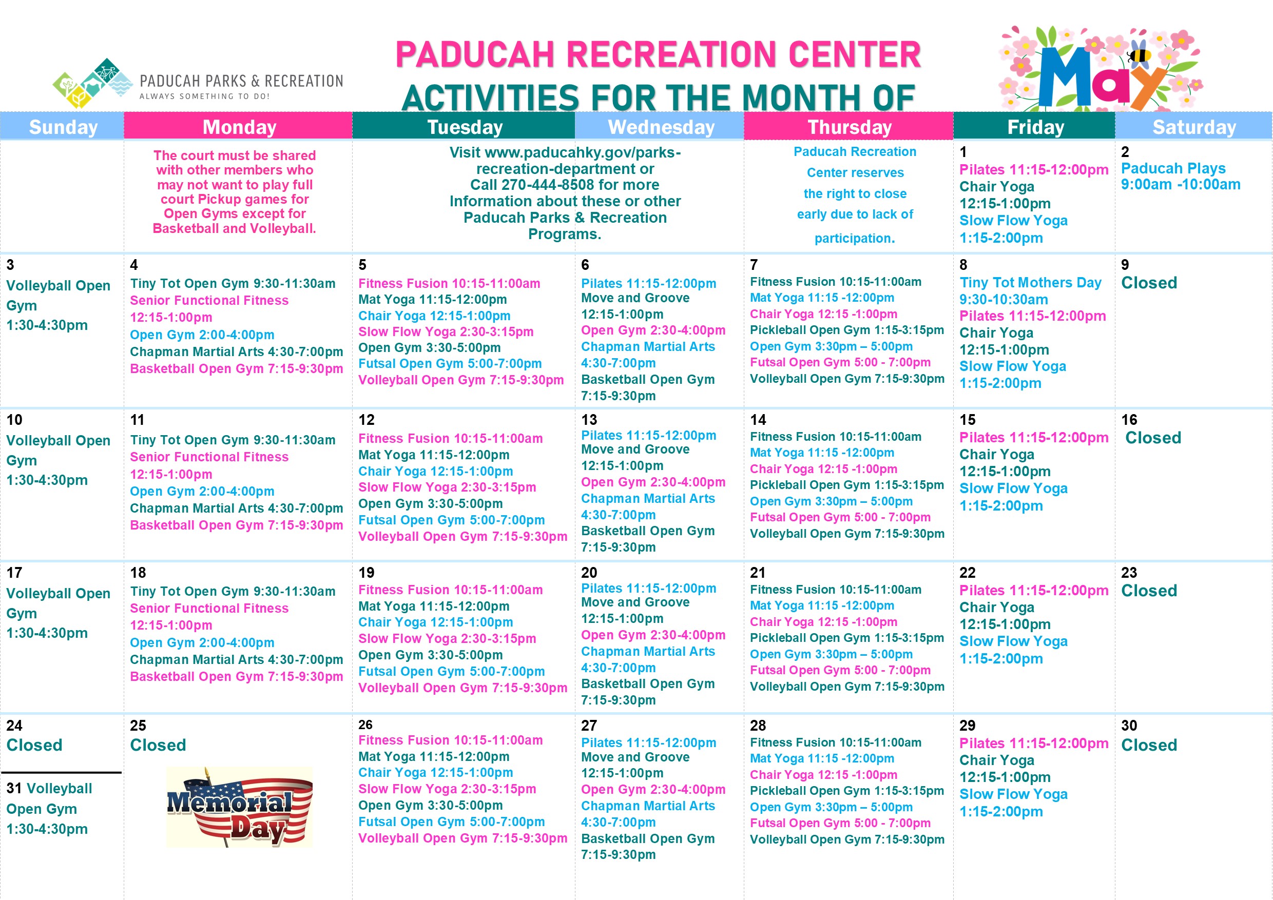 - Paducah parks & Recreation is not responsible for lost or stolen items.